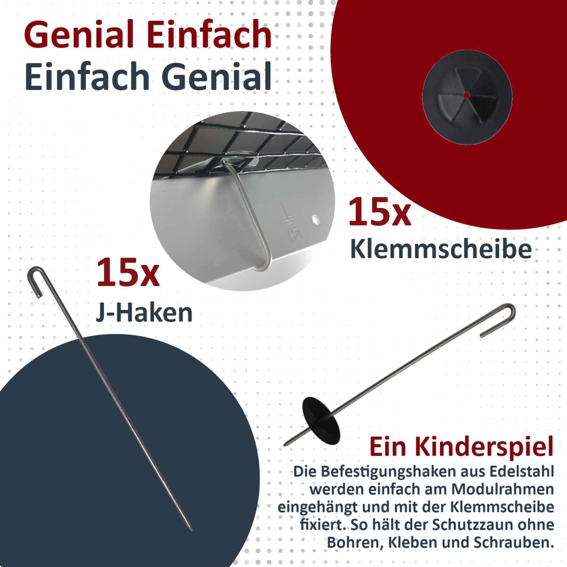 Die Montage ist ebenso einfach wie bei den Komplettsets: Der Schutzzaun kann an alle gerahmten Solarmodule angebracht und an gängige Dacheindeckungen angepasst werden. Dank des enthaltenen Befestigungsmaterials (15 J-Haken und 15 Klemmscheiben aus Edelstahl) ist der Aufbau schnell erledigt.